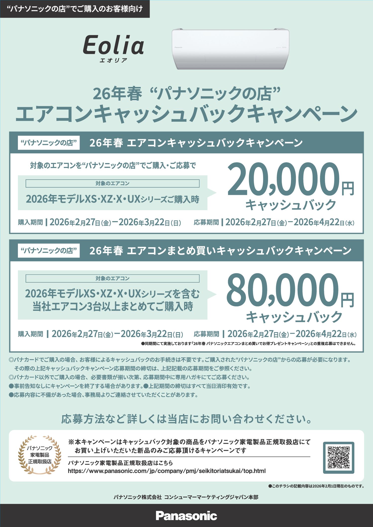 26年春“パナソニックの店”エアコンキャッシュバックキャンペーン